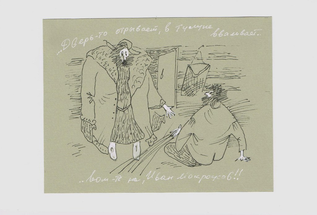 «Дверь-то открывает, в тулупе вваливает...». Из серии иллюстраций к литературному произведению Г.С Райшева «Сибирские бывальщины»