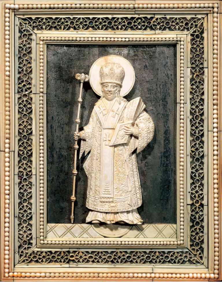 Кость моржовая, кость животная, фольга, дерево, металл, бумага/ резьба сквозная, резьба рельефная, резьба объемная, гравировка, монтирование. Икона в деревянной раме: высота 28 см, ширина 23,8 см, толщина 3 см, икона: высота 25,2 см, ширина 19,5 см.