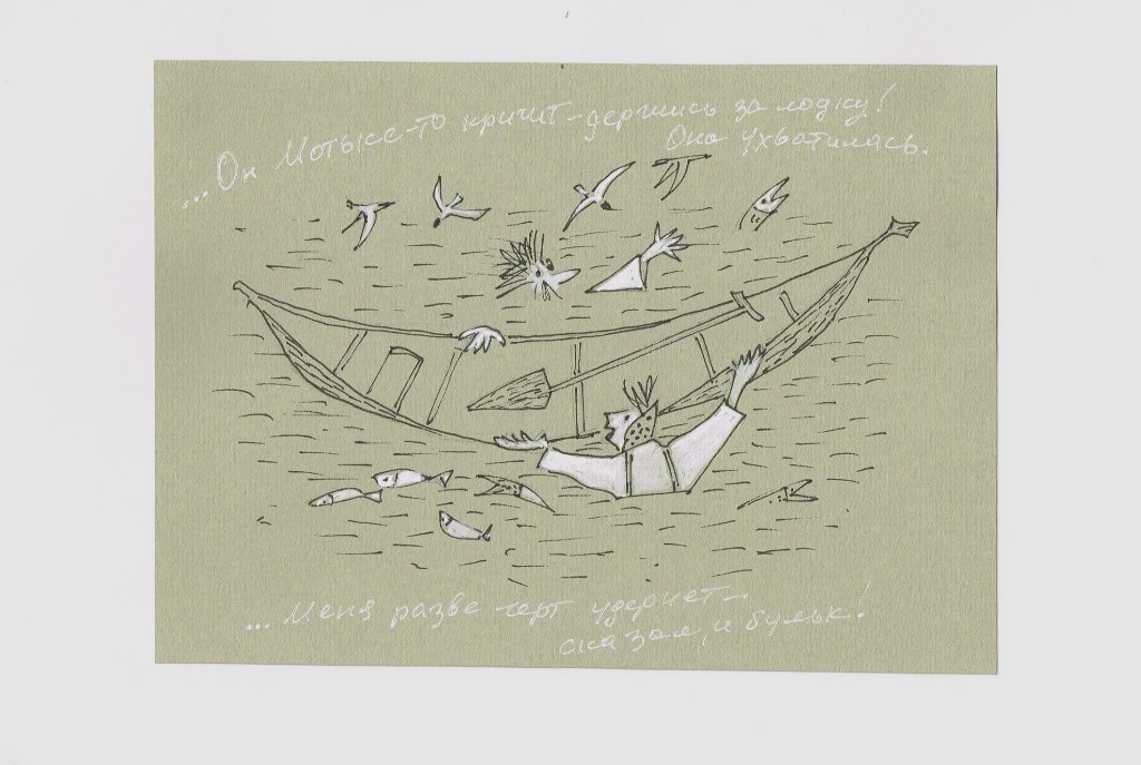 «Он Мотьке-то кричит: «Держись за лодку!». Она ухватилась». Из серии иллюстраций к литературному произведению Г.С Райшева «Сибирские бывальщины»