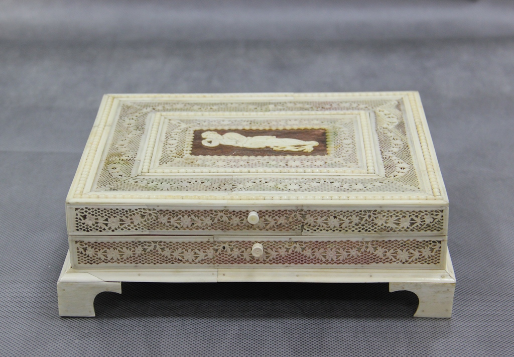 Дерево, кость животная, кость животная, фольга, бумага, ткань, металл/ резьба сквозная, резьба рельефная, монтирование. 7х21х17 см.