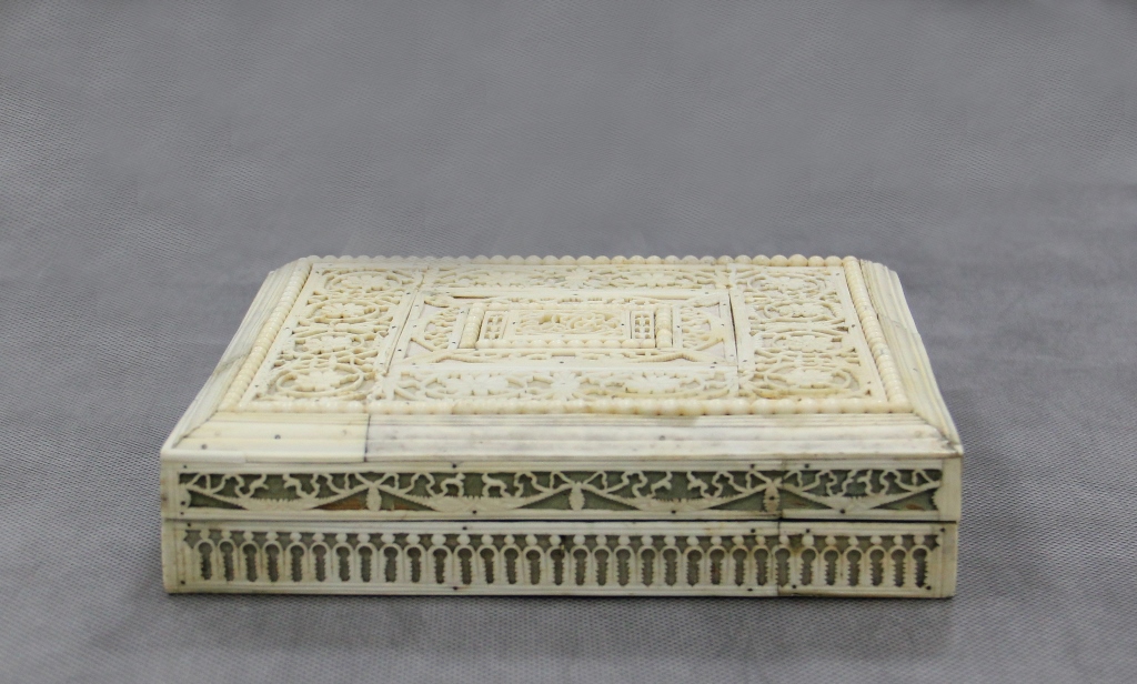 Дерево, кость моржовая, кость животная, ткань, металл/ резьба сквозная, резьба рельефная, монтирование. 4,5х19,4х17,7 см.