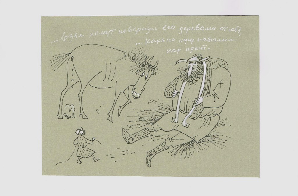 Государственный художественный музей«Взял хомут, повернул его деревами от себя. Карько кучу навалил, пар идет». Из серии иллюстраций к литературному произведению Г.С Райшева «Сибирские бывальщины»
