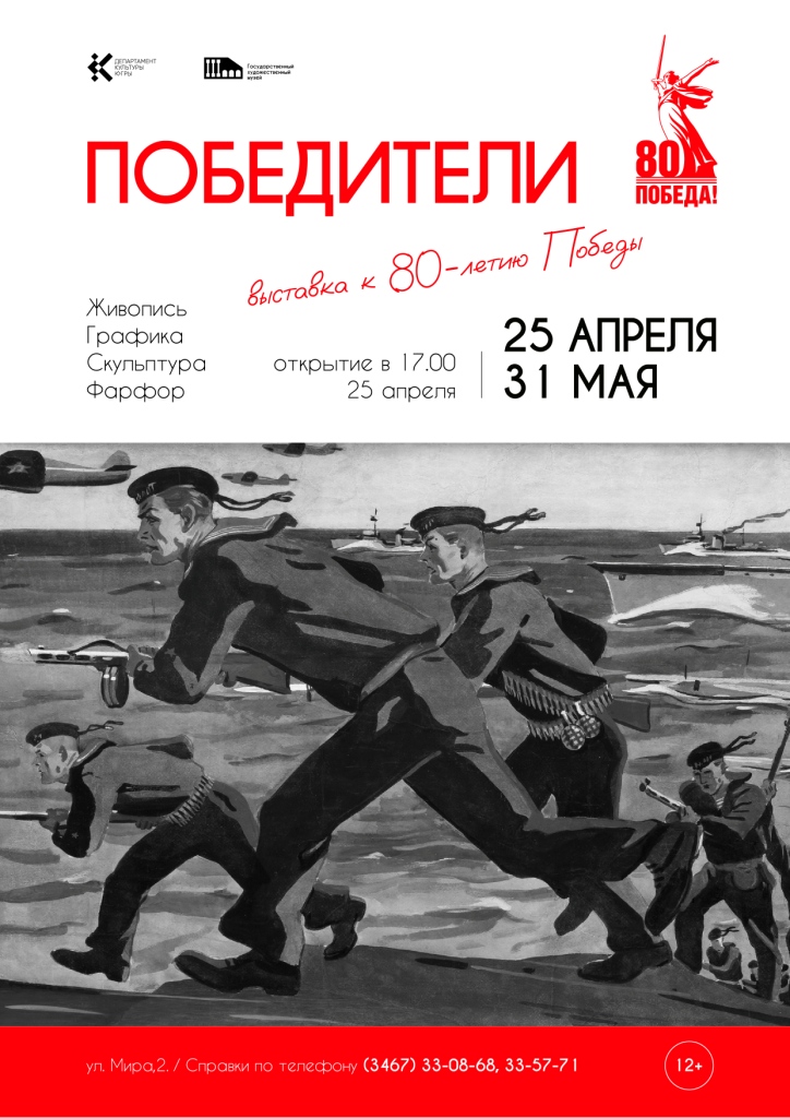 25 апреля 2025 года в 17.00 в Государственном художественном музее Югры открывается выставка «Победители», посвященная 80-летию Победы в Великой Отечественной войне. Выставка включает живопись, графику, скульптуру и декоративно-прикладное искусство художников XX века – Александра Дейнеки, Гелия Коржева, Ивана Астапова, Софьи Урановой, Евгения Вучетича, Олега Комова и других авторов.