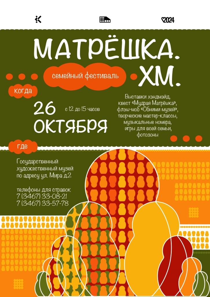 26 октября Государственный художественный музей проводит в Югре семейный фестиваль. Выставки хэндмэйд, увлекательный квест «Мудрая Матрёшка», флэш-моб «Обними музей», творческие мастер-классы, музыкальные номера, игры для всей семьи, фотозоны – всё это и многое другое – программа семейного фестиваля «Матрёшка.ХМ».