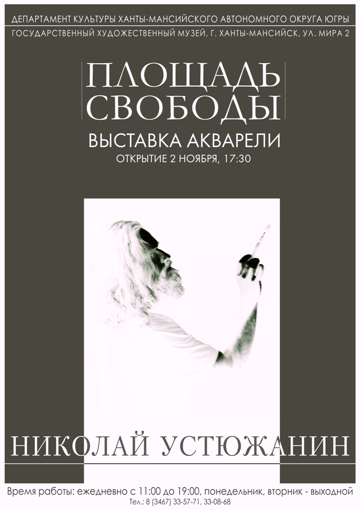 2 ноября в 17.30 в Государственном художественном музее в рамках цикла «Художники Югры» открывается персональная выставка Николая Устюжанина «Площадь Свободы». На выставке представлены избранные произведения, выполненные за последние три года в технике акварели. Площадь Свободы – свое название выставка получила благодаря серии работ выполненных на площади в Самарово.