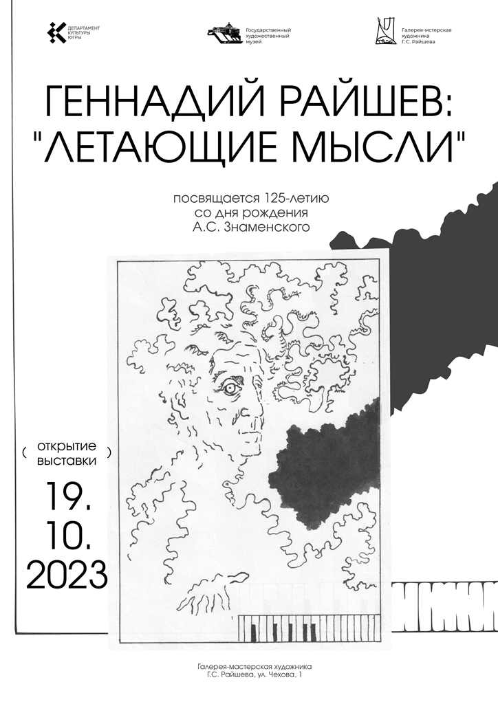 19 октября в 16.00 в Галерее-мастерской Г.С. Райшева состоится презентация выставки «Геннадий Райшев: «Летающие мысли», посвященной 125-летию со дня рождения известного сургутского педагога Аркадия Степановича Знаменского, оставившего яркий след в истории образования Западной Сибири.