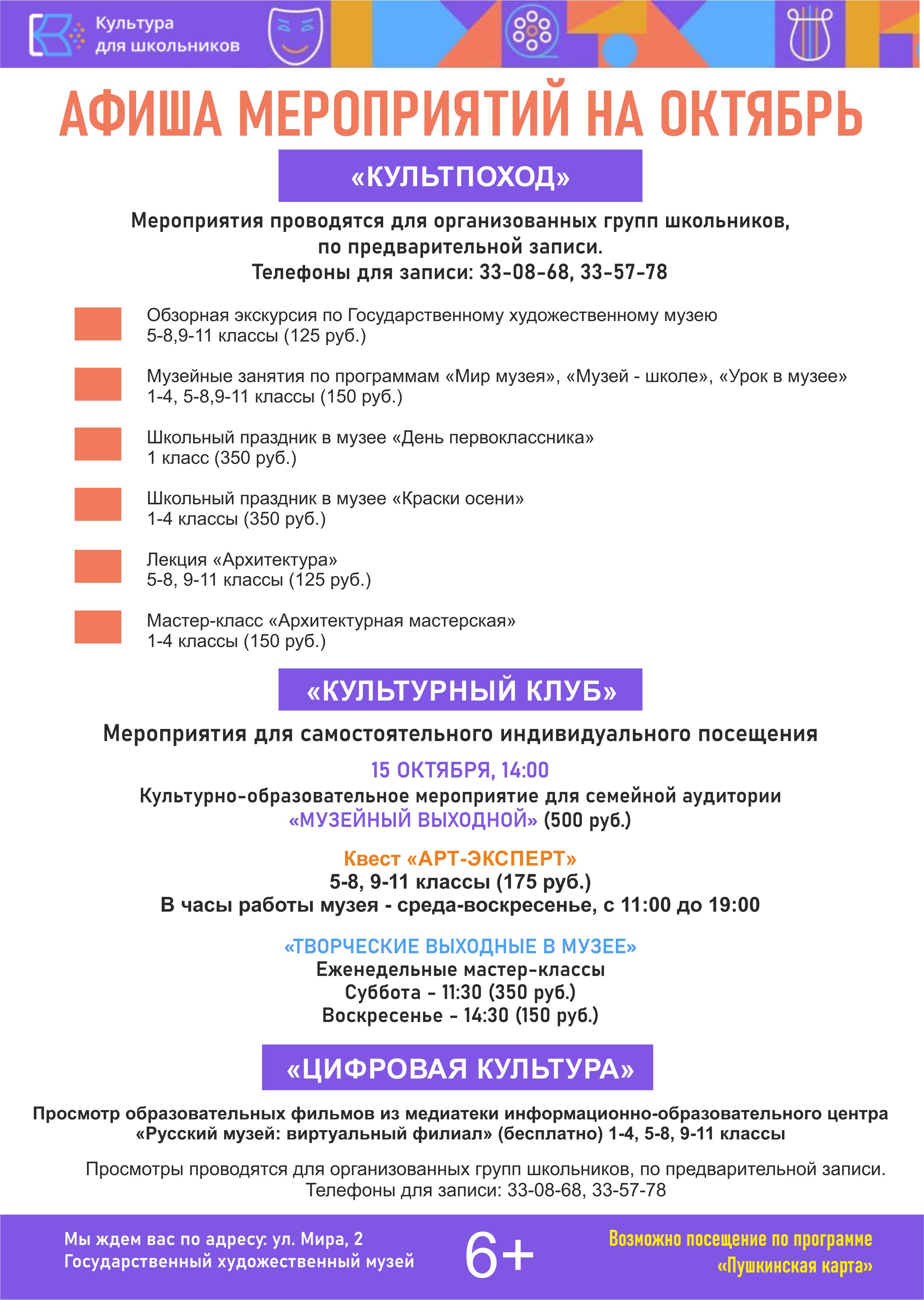 Приглашаем школьников на мероприятия в рамках проекта «Культура для школьников». В октябре мы приготовили для вас насыщенную культурную программу!