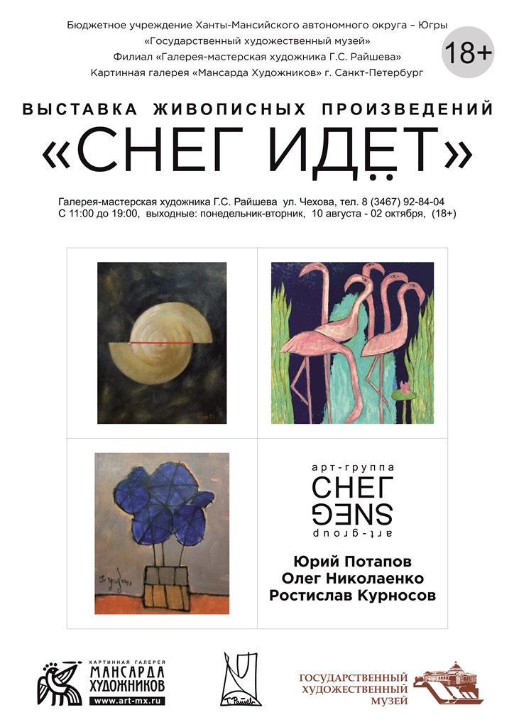 10 августа в 16.00 в Галерее-мастерской художника Г.С. Райшева в рамках проекта «Геннадий Райшев: Диалоги» состоится открытие выставки Арт-группы «СНЕГ» из Санкт-Петербурга.