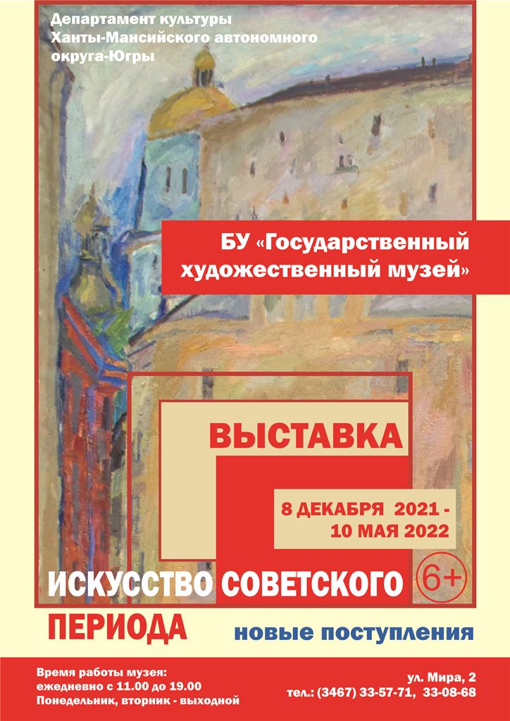 8 декабря 2021 в Государственном художественном музее открывается выставка новых поступлений «Искусство советского периода». Будет представлена часть коллекции отечественного искусства XX века (произведения советских художников 1960-1980-х гг.), переданной в 2021 году в фонды Государственного художественного музея Югры по распоряжению Министерства культуры Российской Федерации.