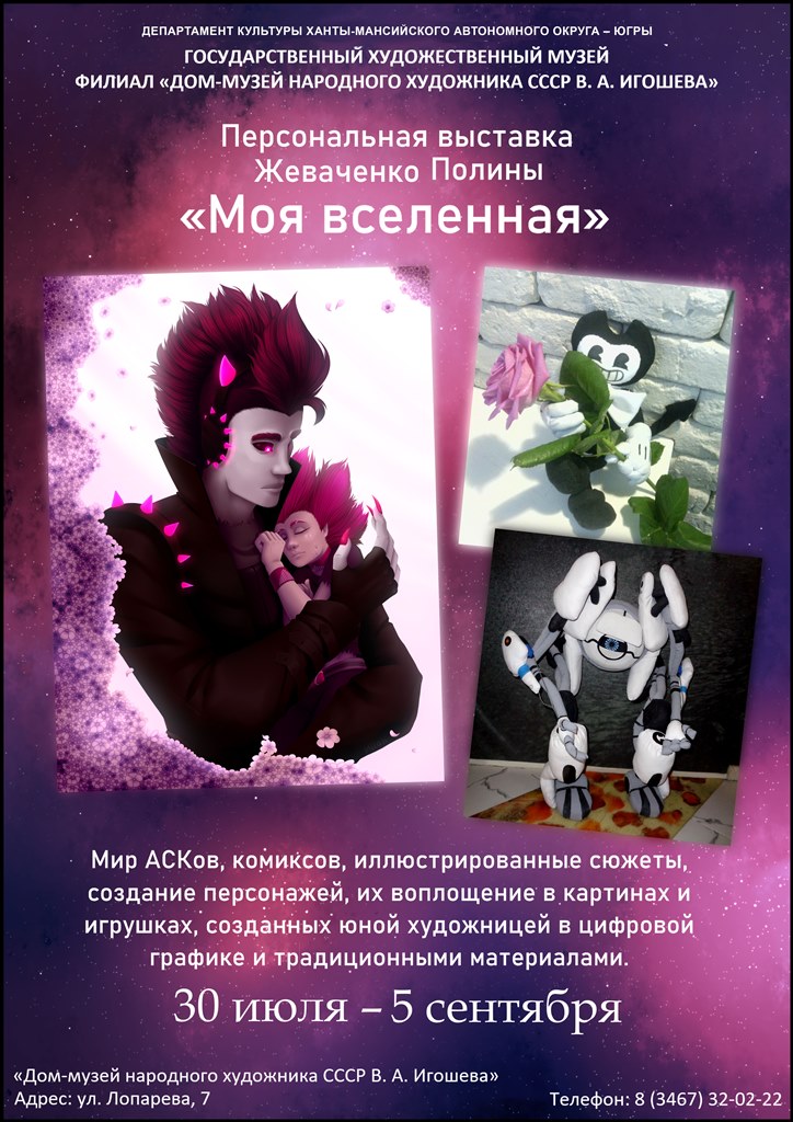 30 июля в филиале Государственного художественного музея «Дом-музей народного художника СССР В. А. Игошева» состоится открытие персональной выставки юной художницы Полины Жеваченко.