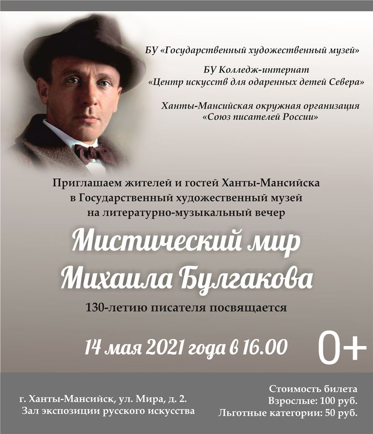 14 мая в 16.00 в зале русского искусства Государственного художественного музея состоится литературно-музыкальный вечер, посвященный 130-летию со дня рождения Михаила Афанасьевича Булгакова.