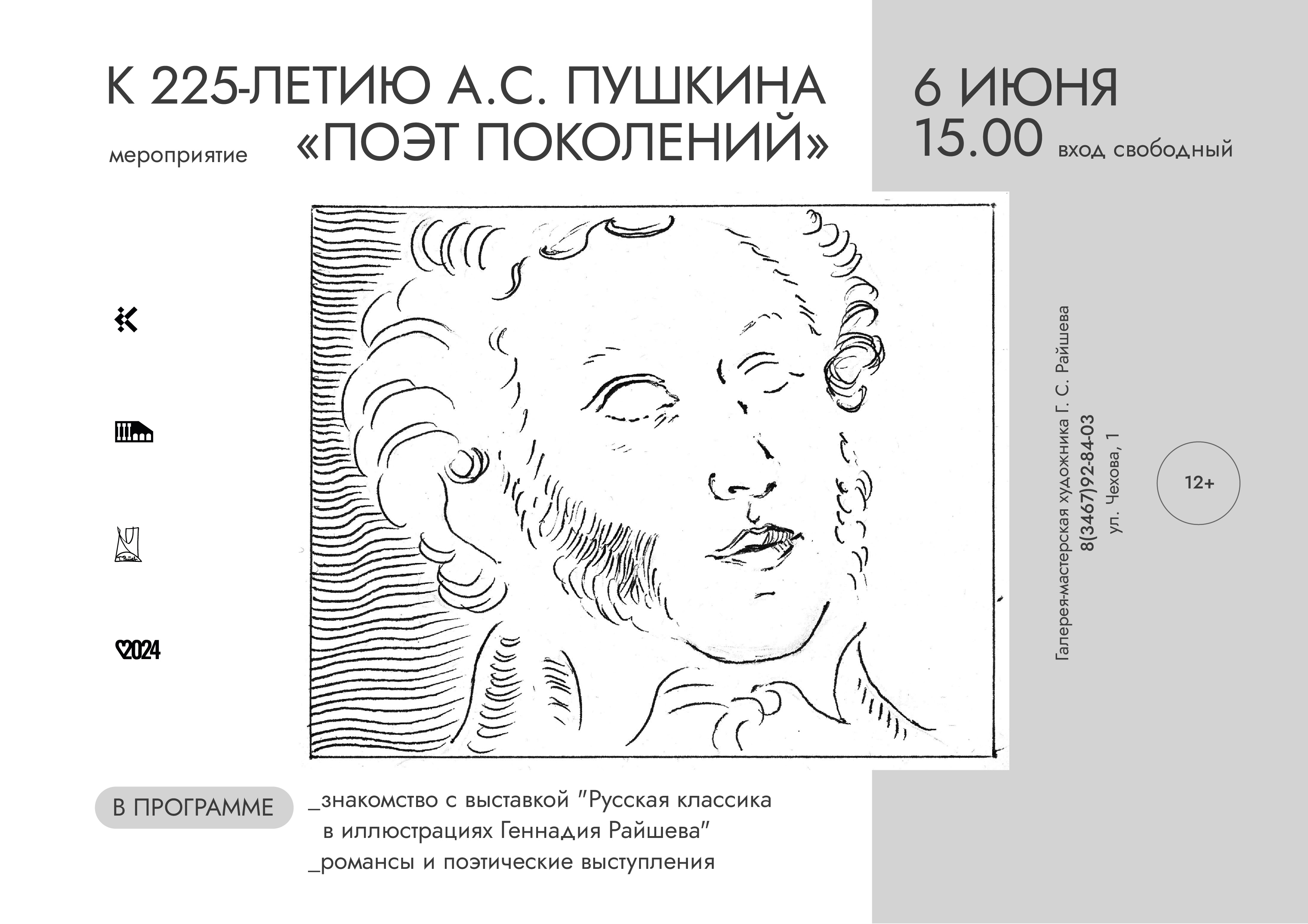 В пушкинский день, 6 июня, в филиале Государственного художественного музея «Галерея-мастерская художника Г.С. Райшева» состоится мероприятие «Поэт поколений».