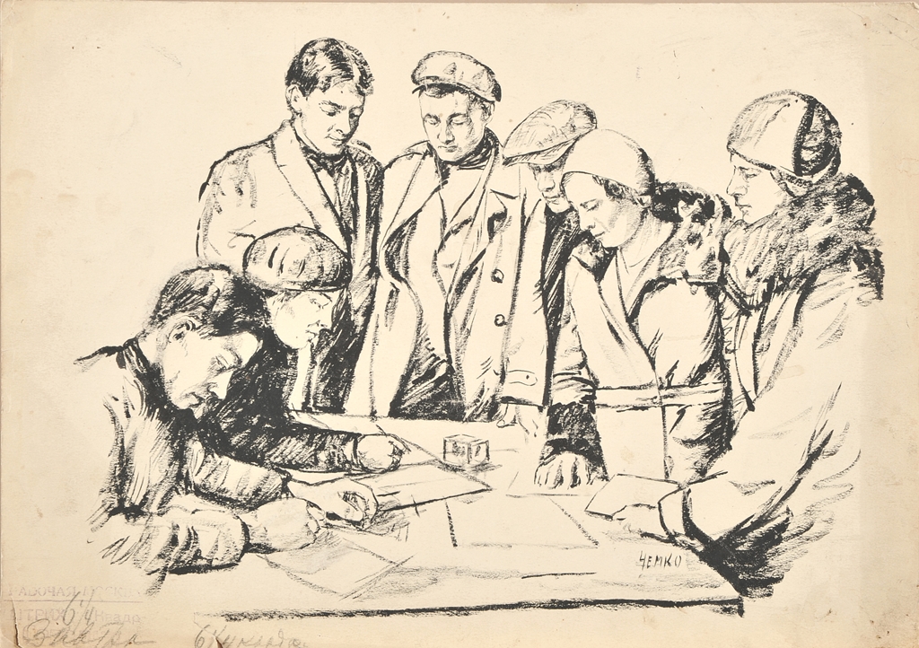 Графические произведения К.П. Чемко и Г.М. Глюка 1930-х и 50-х годов посвящены теме человека труда и отражают важные моменты советской жизни: «Проработка плана посевных работ в 7-ой бригаде», «Штаб по борьбе с паводком Фрунзенского района. Регистрация дружинников по борьбе с паводком» и другие.