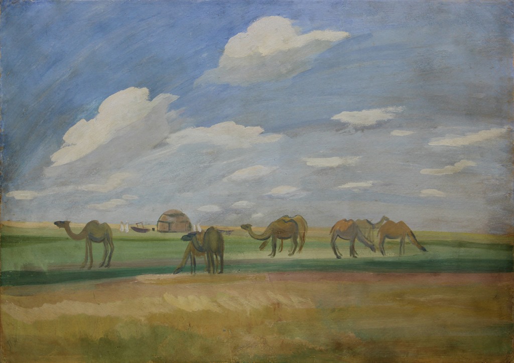 Наиболее ранними на выставке являются две живописные работы П.В. Кузнецова (1878-1968) «В степи» (1912) и «В кошаре» (1913). Павел Кузнецов – живописец, создатель и член объединения «Голубая роза», один из самых гармоничных русских художников. В конце 1900-х — начале 1910-х гг. он совершил ряд поездок в Заволжье и Среднюю Азию, после чего создал «степную», или «киргизскую» серию картин, в которых открыл цельность бытия и гармонию между человеком и природой.