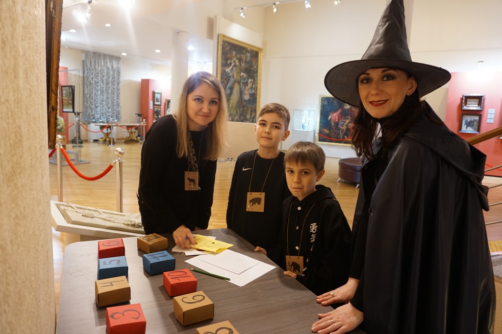 Отважные путешественники побывали в салоне Пиковой дамы, где познакомились с выставкой «Дамские штучки», и создали эскиз костюма в Модном ателье. Нашли ключи, спрятанные в экспонатах выставки фарфора, а в учебном классе мадам Фыр-Фыр сдали экзамен по семьеведению. Подсказки на картинах русских художников привели участников в семейный фотосалон.