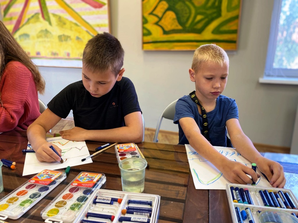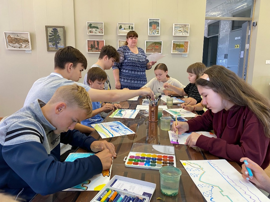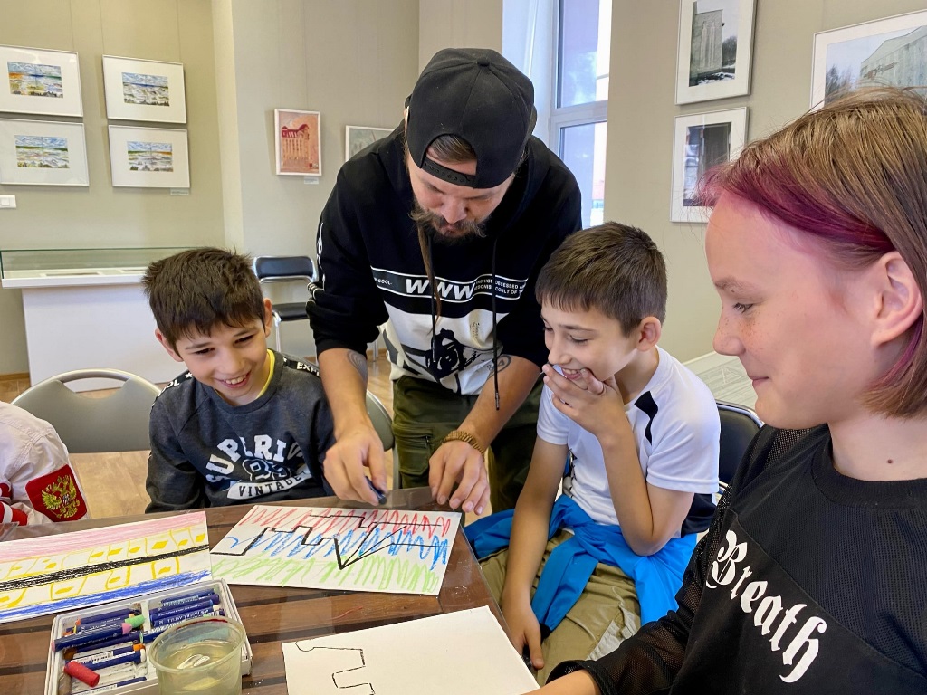 Далее для участников состоялся творческий мастер-класс «Моя Родина». Под руководством художника Владислава Алеева дети и взрослые создавали тематические композиции в смешанной технике с образами Ханты-Мансийска - ассоциации с родным домом.