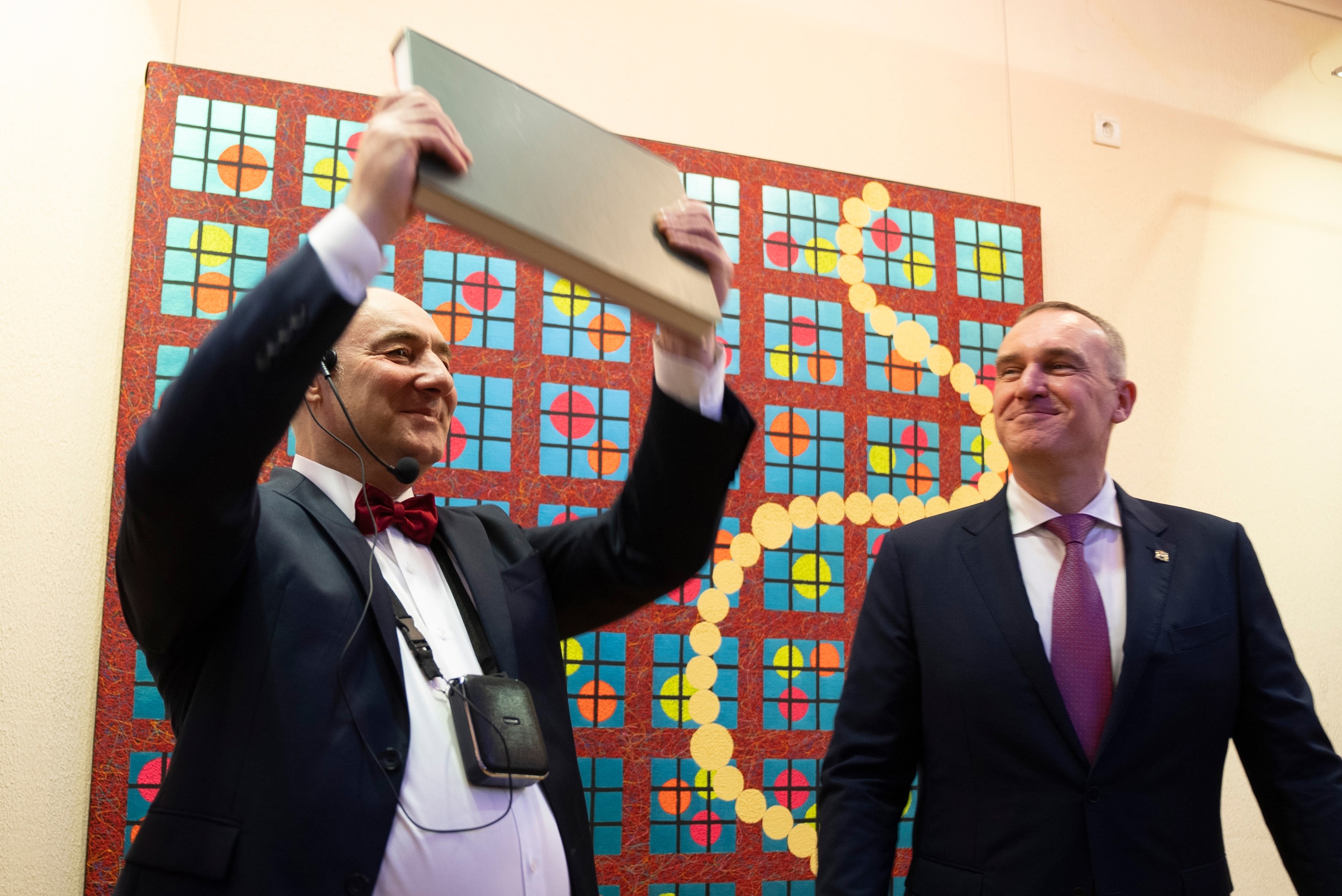Игорь Рязанцев с большим воодушевлением поблагодарил всех за возможность представить свои работы в Ханты-Мансийске: «Хочу поблагодарить Югру и руководителя региона Руслана Николаевича Кухурака. Говорю слова благодарности заместителю губернатора Елене Майер, с которой дружим много лет. Большая признательность коллективу музея во главе с Еленой Кондрашиной. Мы почти мгновенно, всего за два дня смонтировал выставку. Поверьте, это было очень непросто. Я благодарен всем, кто сегодня пришел на мою выставку. Я постараюсь не разочаровать, а удивить и всех тех, кто еще заглянет в музей. Знаете, филумизм начался не сразу со шприца и акриловых нитей. Сначала это были оргстекло и проволока, и у меня неплохо получалось. Но хотелось чего-то традиционного, работать на холсте, которому тысячи лет. А знаете, из чего акрил делается? Из нашей родной нефти!»