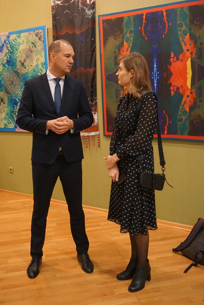 На открытии экспозиции искусствовед и автор многих работ Ксения Илауски рассказала о процессе создания произведений и о результатах деятельности Арт-резиденции. Директор Центраремёсел Ольга Дмитриевна Бубновене презентовала серию платков «Нефть», выполненную в соавторстве с Жамилем Айзатуллиным.