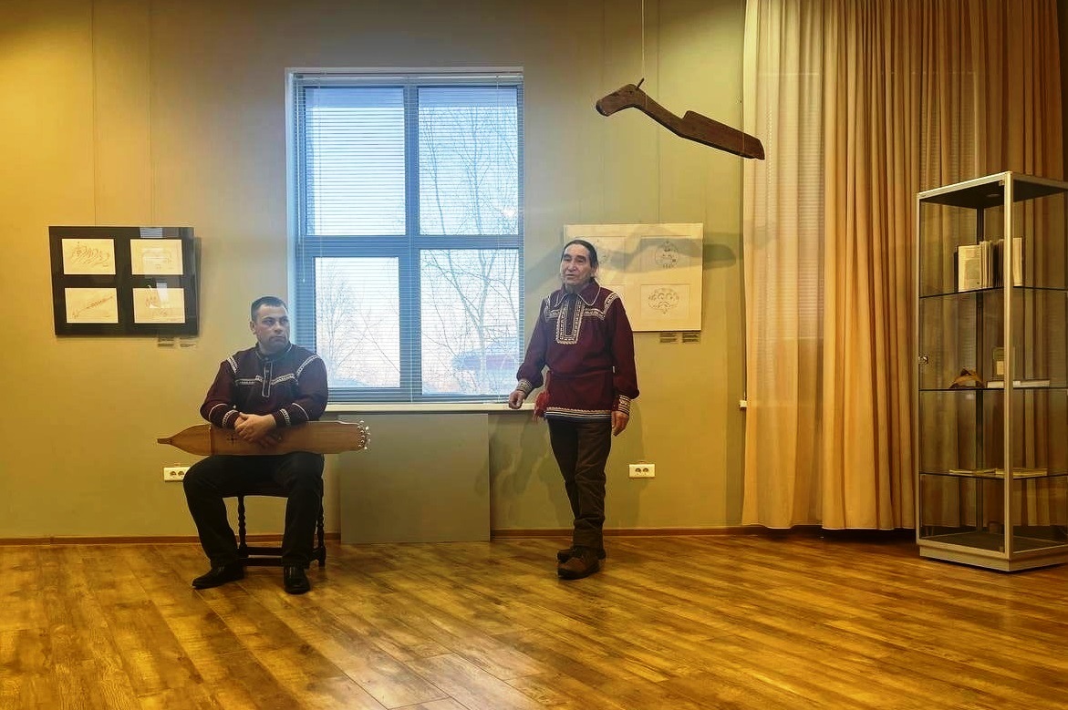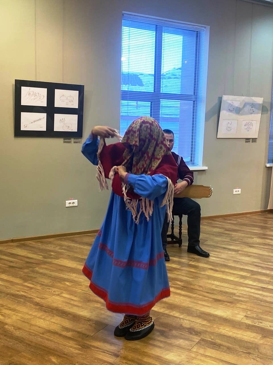 Фольклорную программу представили специалисты окружного дома народного творчества Тимофей Молданов (песня казымской богини) и Алексей Рещиков (музыкальное сопровождение на санквылтапе), театра обско-угорских народов – Юлии Яркиной (женский танец «Куренька»).