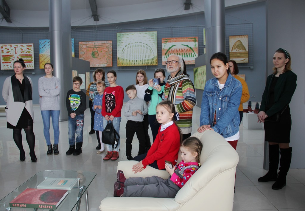 Геннадий Степанович встретил участников в Большом зале, в экспозиции «Человек. Природа. Космос» и познакомил со знаковыми монументальными полотнами - «Знак Югорской земли», «Пространство поля», «Югорское пространство» и «Югорская легенда». Зрителям, особенно самым юным, оказался близок замысел художника, поэтому общение с Мастером прошло в форме диалога. Эмоционально-зрительное погружение в мир образов космического восприятия Райшева дополнил видеофильм с музыкальным сопровождением композитора Эдуарда Артемьева.