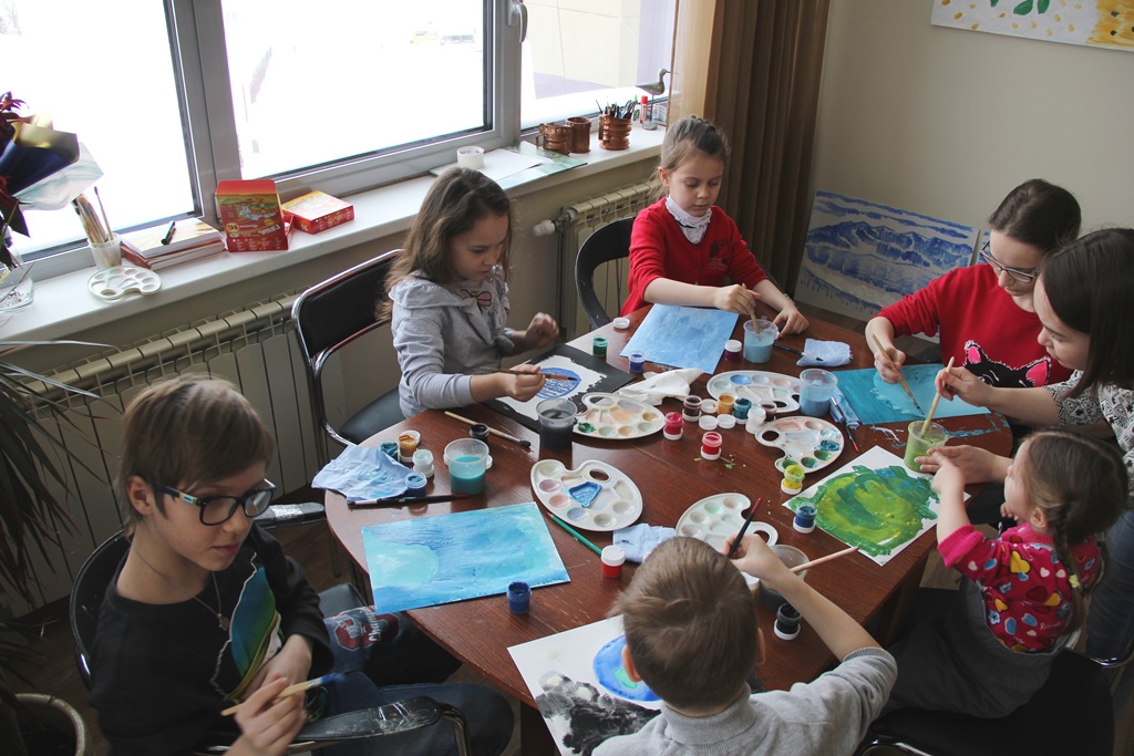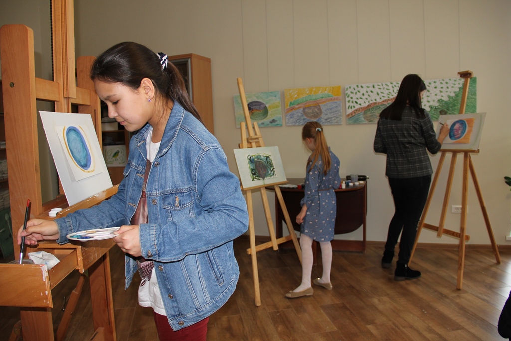 Занятие продолжилось в мастерской художника. Сама обстановка мастерской с запахом краски, живописными произведениями, мольбертами располагала к творческому диалогу. Каждый участник, включая Маэстро, создал свой живописный образ Земли в космическом пространстве. В завершение мастер-класса юные художники услышали важные слова о своих работах от Геннадия Степановича Райшева, для которого важно приобщение молодого поколения к искусству, творчеству.
