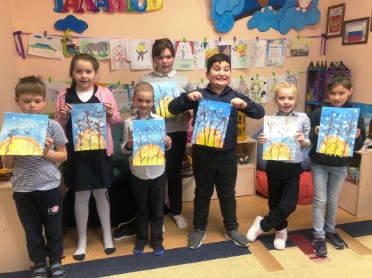 На практической части занятия воспитанники центра, вдохновленные услышанным, принялись за рисование: на красочных композициях появились солнце, голубое небо и веточки вербы с набухшими почками.