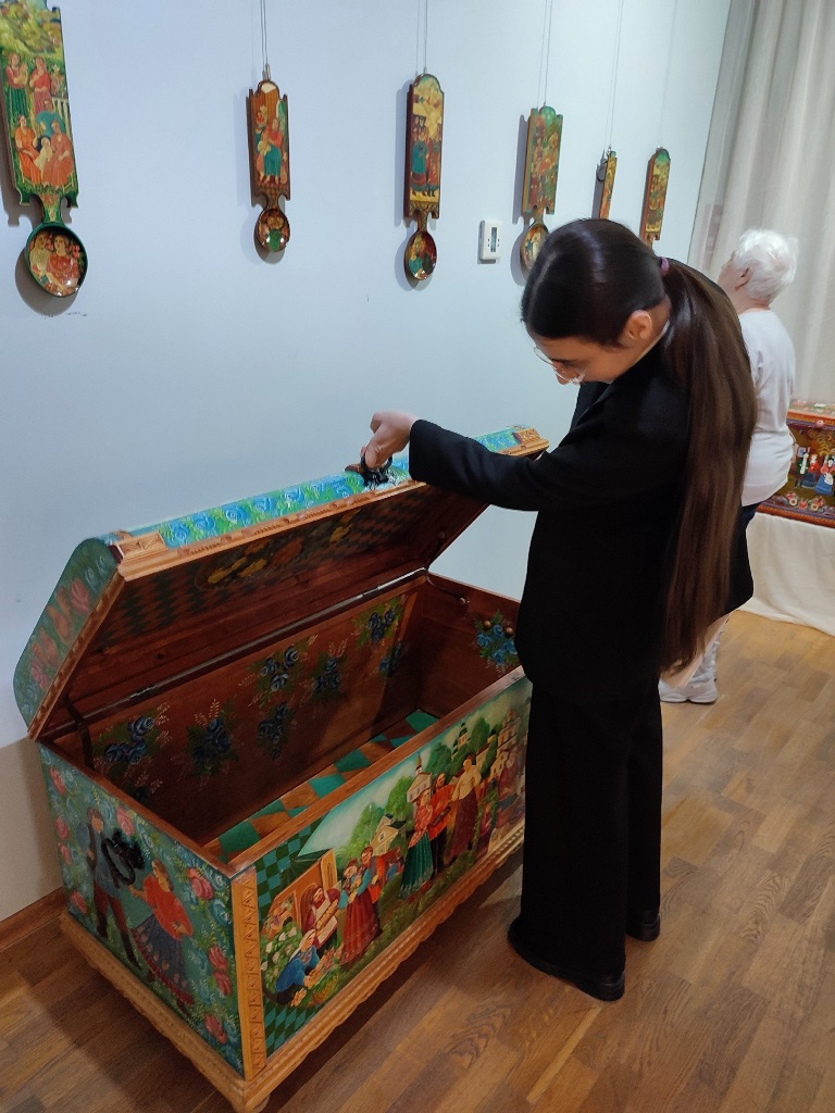 Расписные свадебные сундуки и ларцы, детские игрушки и сюжетные панно – все наполнено духом соборности и веры в то, что человеческое счастье обретается в семье. Отсюда в рисунках и обустроенность мира с нарядными домами и храмами, в которых крестят детей, лад гармоней и балалаек в руках статных парней, достоинство, с которым выступают нарядные девушки. Желание рассмотреть детали росписи уводит в дальнюю перспективу среднерусского ландшафта, где вдруг замечаешь забавную сценку с домашними животными или художника с мольбертом.