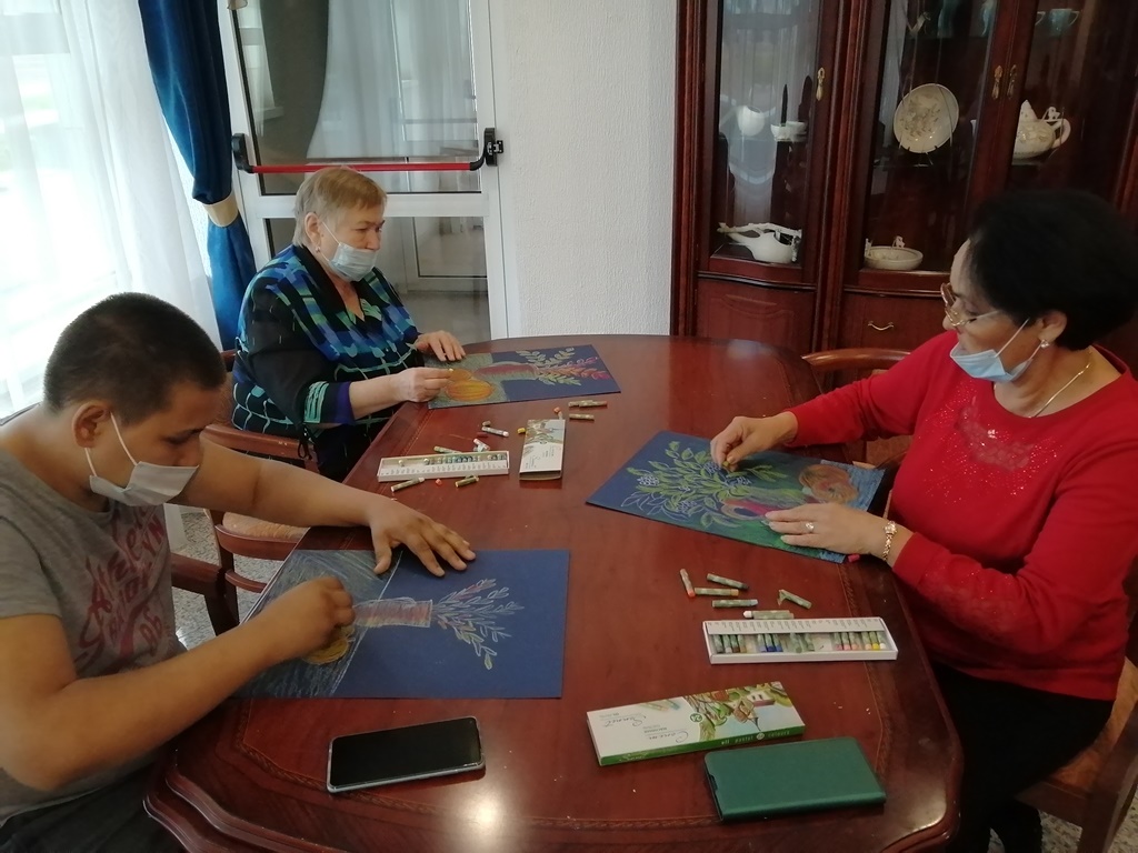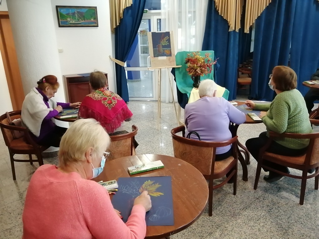 В продолжение мероприятия состоялся художественный мастер-класс «Осенний натюрморт». Участники создали яркие рисунки с изображением букета рябины и тыквой в технике масляной пастели.