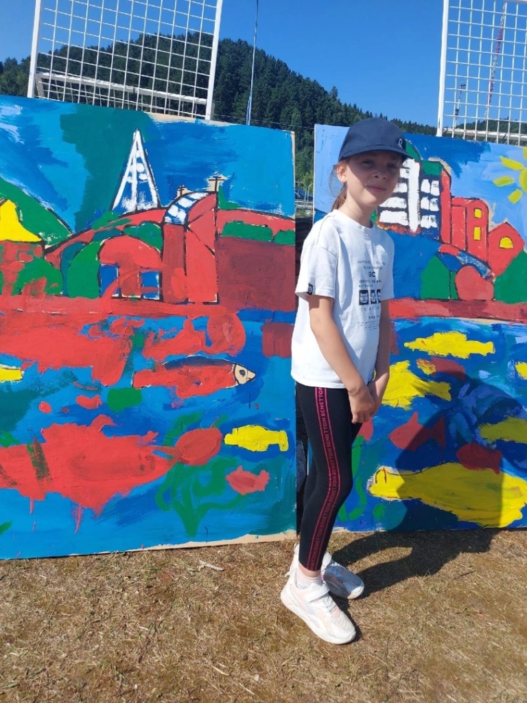 Еще один арт-объект «Город на реке» создавали с помощью красок – реку, рыб, красивые здания Ханты-Мансийска и, конечно, наши зеленые холмы нарисовали на листах фанеры.