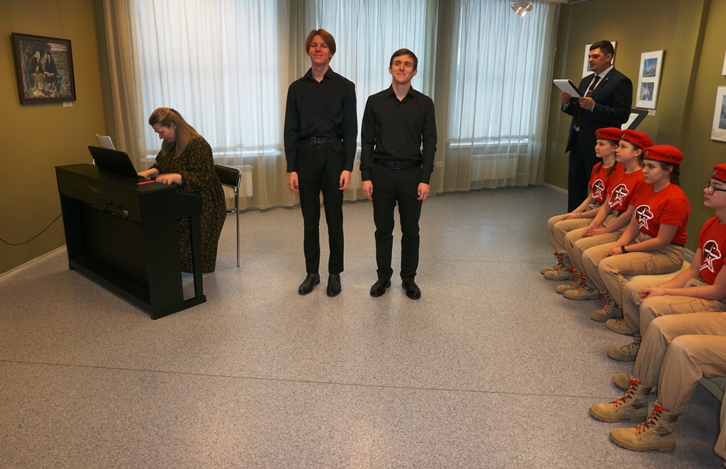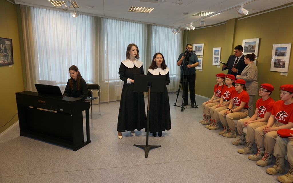 Учащиеся и педагоги музыкального отделения колледжа-интерната «Центр-искусств для одаренных детей Севера» выступили с музыкальными композициями военных лет. Песни «Алеша» и «Обелиск» звучали в унисон сюжетам произведениям художника-фронтовика В.А. Игошева, монументальным скульптурным композициям Е.В. Вутечича, и коллажам Сергея Ларенкова из проекта «Связь времен», а песню «Катюша», особенно любимую в народе, гости мероприятия спели вместе.
