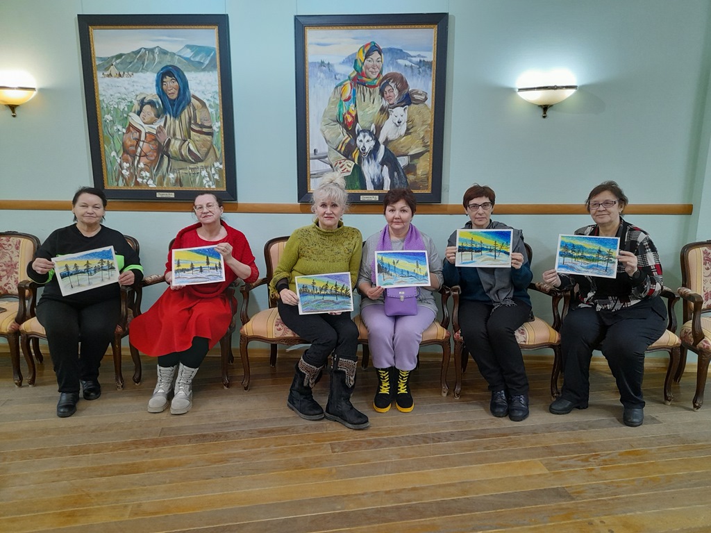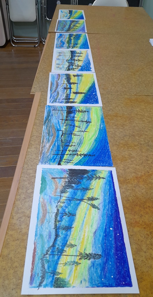 Второе занятие прошло 28 января. Участники рисовали масляной пастелью сказочное северное сияние.