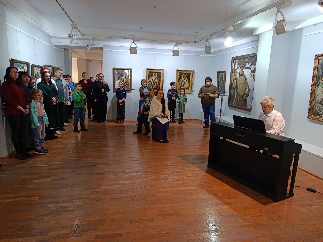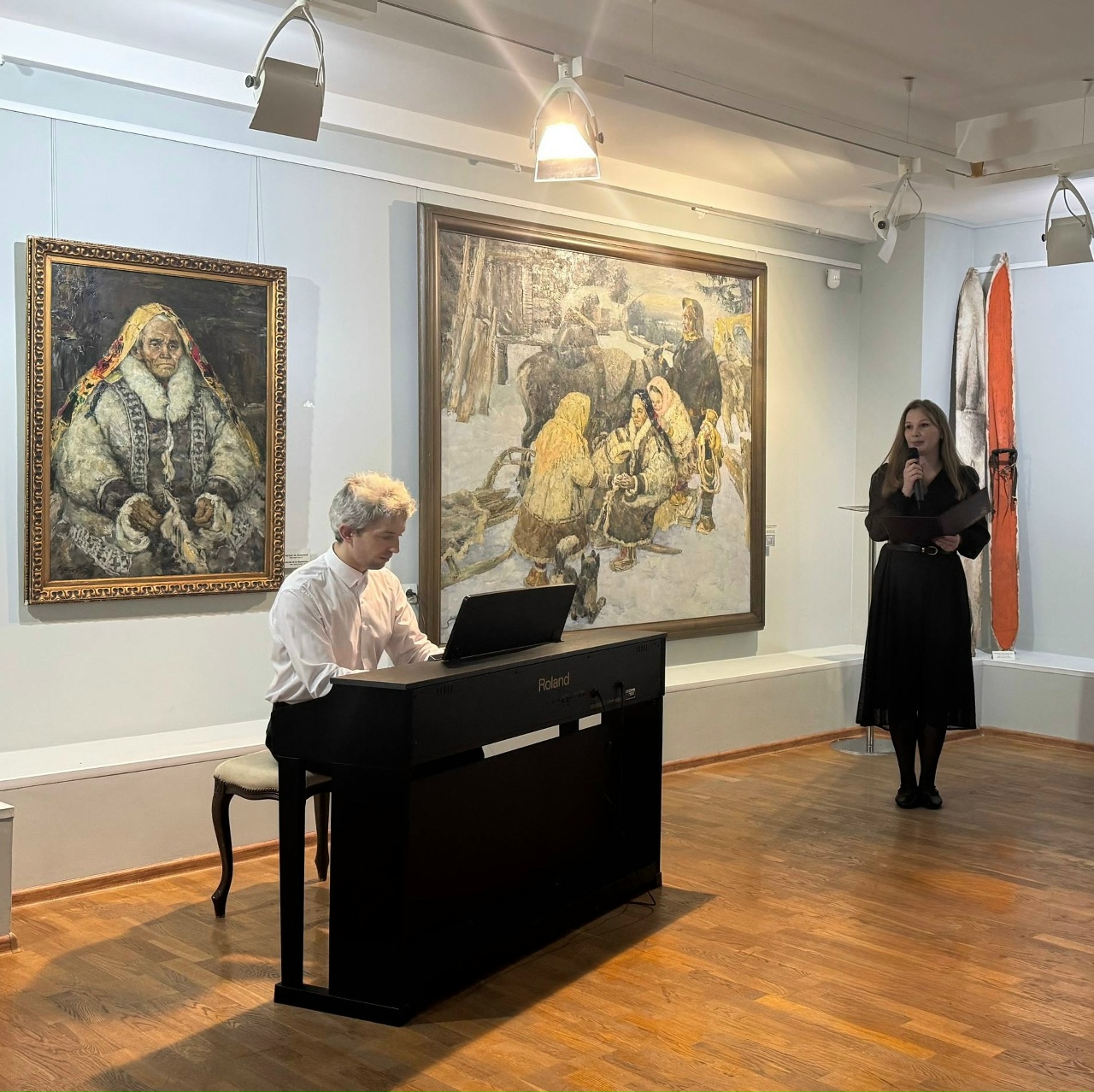 В унисон живописным полотнам Мастера в пространстве экспозиции прозвучали виртуозные импровизации в исполнении солиста Концертного оркестра Югры Алексея Коржова, а также вокально-инструментальная композиция «Морошка» на музыку Елены Кожуховской в исполнении артистки Концертно-театрального центра «Югра-Классик» Софьи Шесталовой.