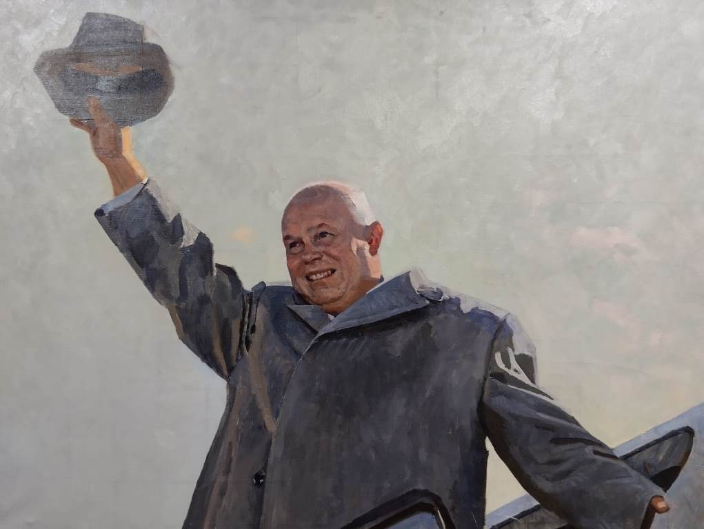 За основу взято фото, где изображен Н.С. Хрущев во время визита в США в 1959 году. Но картина написана уже после Карибского кризиса, который так счастливо разрешился для обеих сторон холодного конфликта.