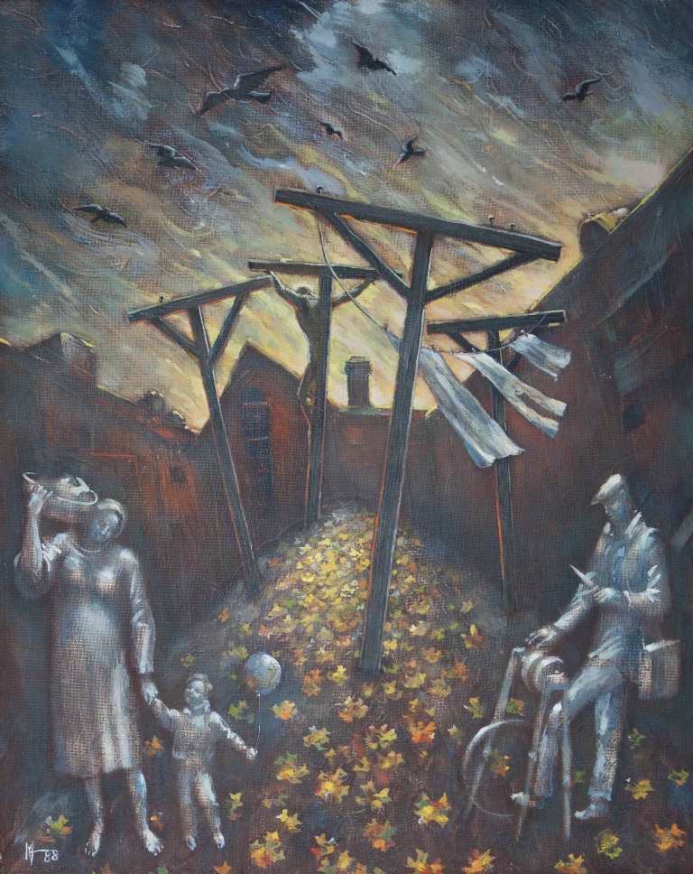 Автор является представителем нонконформистского движения в России. Входил в состав знаменитой "Московской двадцатки", устраивавшей выставки на Малой Грузинской, 28 вплоть до 1987 года. Его стиль можно охарактеризовать как тоскующий сюрреализм. Тревожная направленность видения, общая для нонконформизма, передается в его живописи монохромной гаммой. Что конкретно он имел в виду, изображая распятие в бытовой обстановке, мы выяснить сегодня не сможем. Художник живёт за океаном. Но фантазировать не возбраняется. Чем и займутся посетители будущей выставки.