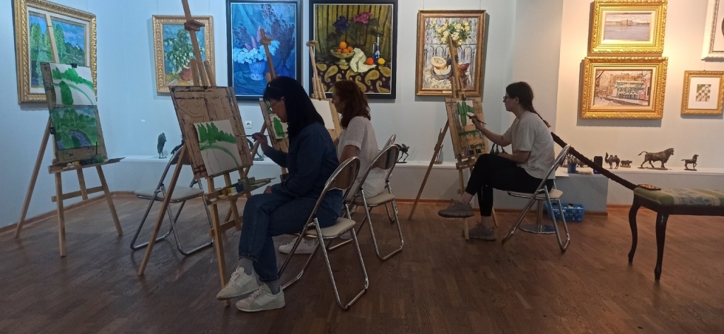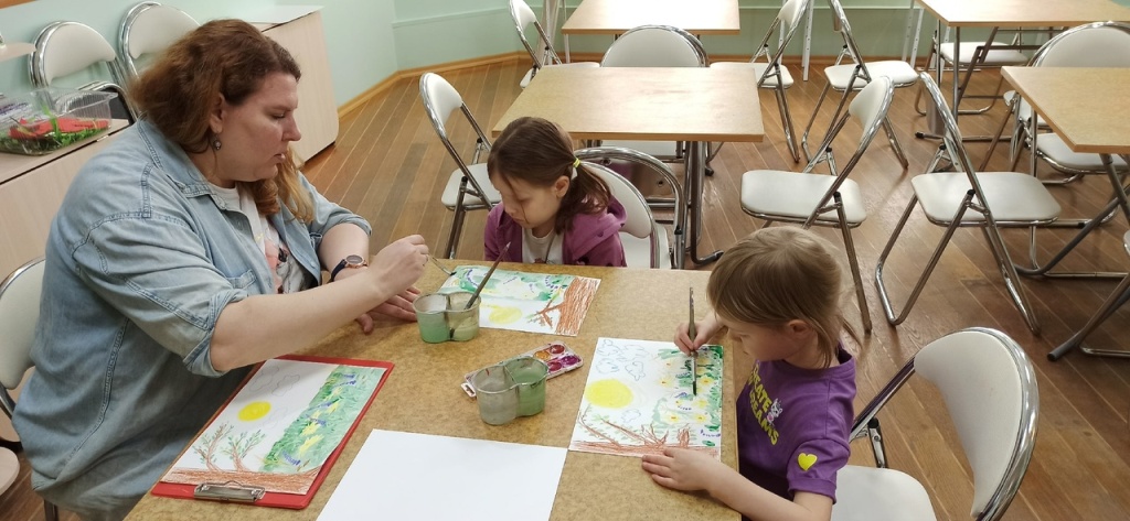 Во второй половине дня посетители художественных мастер-классов создали картину в технике гуаши по произведению художника Ю.В. Матушевского "Зеленый май", 1970г.
