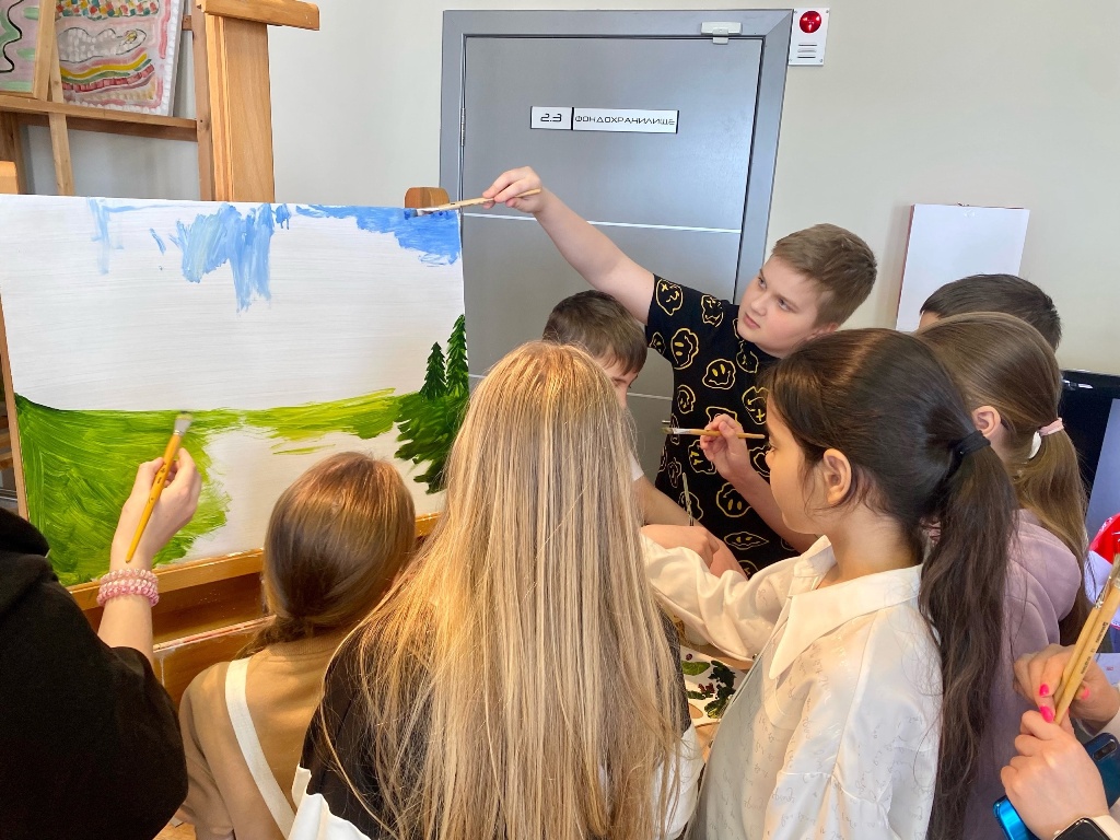 Поддержать учащихся салымской Детской школы искусств пришли ученики ДШИ г. Ханты-Мансийска. Общение продолжилось в мастерской Заслуженного художника России Геннадия Степановича Райшева, где прошла творческая акция. Учащиеся обеих школ создавали коллективные работы за мольбертом Мастера в технике масляной живописи.