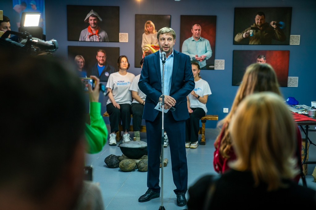 Почетный гость вернисажа Эдуард Басурин в своем обращении выразил благодарность участникам добровольческих миссий за их неоценимую помощь населению Донбасса.