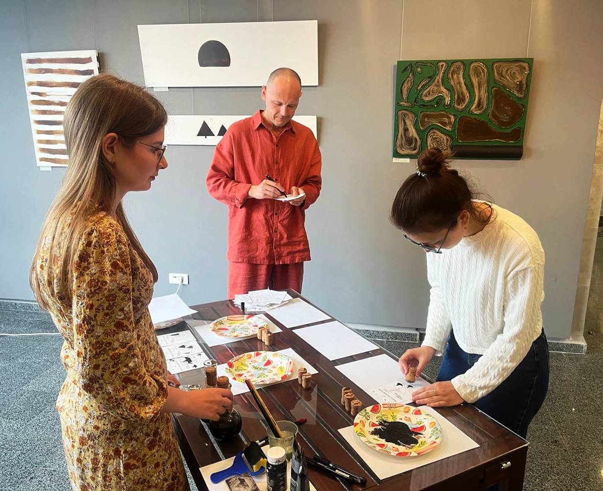 Приятным и неожиданным подарком для гостей вечера стал творческий перформанс от художника «Так она дороже». Начался он в холле галереи-мастерской с автограф-сессии с автором и изготовлением посетителями памятных сувениров: на пригласительных билетах гости отпечатывали штампы с авторскими образами - елкой, кораблем и каплей нефти, а художник ставил автографы на получившемся сувенире. Далее, в пространстве выставки «Новые смыслы», автор разыграл среди присутствующих графическую композицию из цикла «Так она дороже».