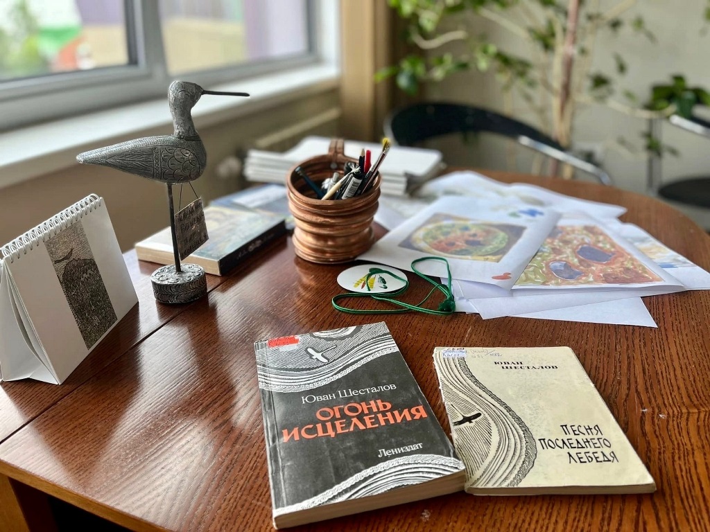 Художником в разные годы были оформлены книги Ю.Н. Шесталова: «Когда качало меня солнце», «Песня последнего лебедя», «Огонь исцеления». На выставке представлены издания «Песня последнего лебедя» и «Огонь исцеления», предоставленные Государственной библиотекой Югры.