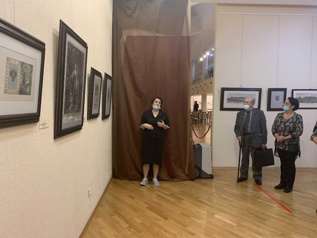 На экскурсии по выставке из фондов музея, посвященной 300-летию утверждения титула Императора Всероссийского, посетители познакомились с графическими произведениями XIX-XX веков – портерами Петра I, Николая I, Екатерины II, Елизаветы Петровны и гравюрами в жанре пейзажа-ведута с изображением императорских дворцов, а также бюстом Александра I.