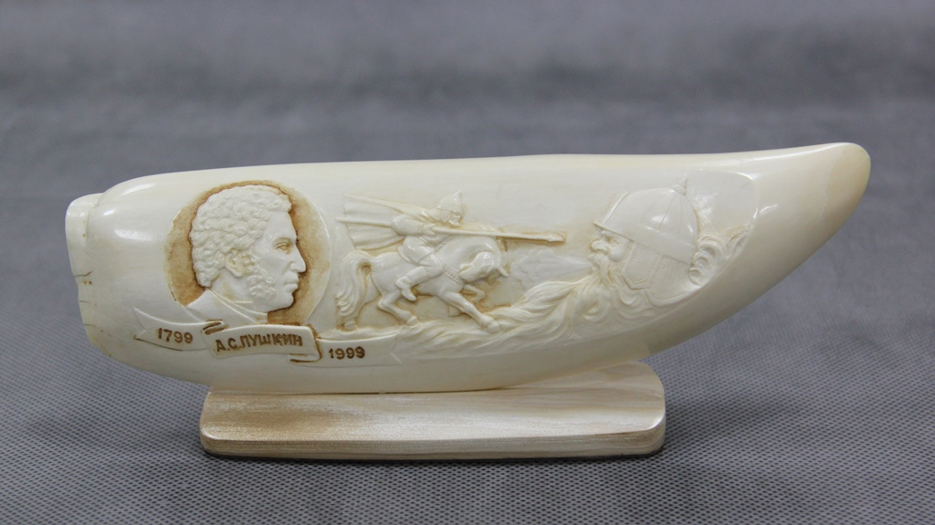 Бивень мамонта, зуб кашалота, кожа/ резьба рельефная, гравировка, тонирование, монтирование 6,5х21х5 см.