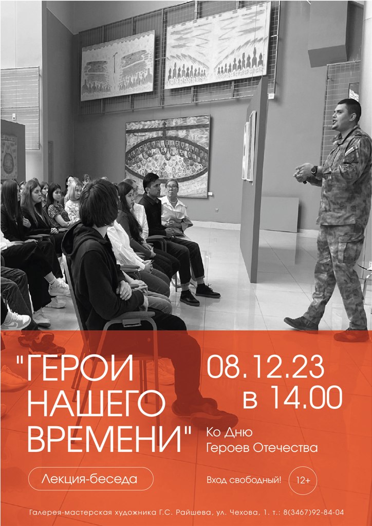 8 декабря 2023 года в 14.00, в преддверии памятной даты Российской Федерации - Дня Героев Отечества в Галерее-мастерской художника Г.С.Райшева состоится лекция-беседа «Герои нашего времени».