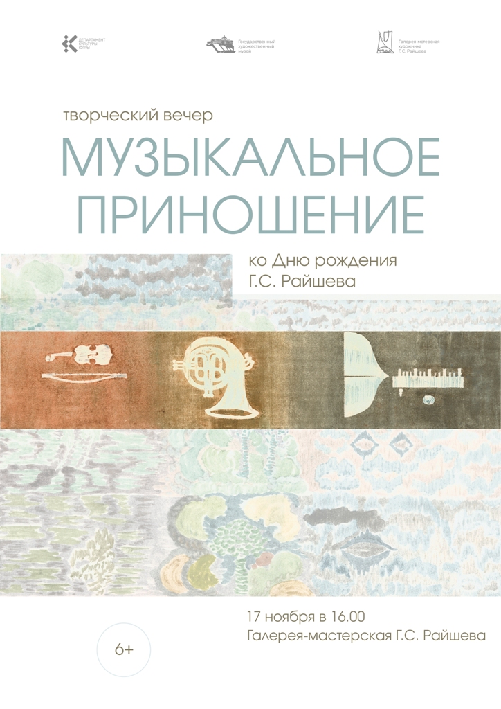 17 ноября в 16.00 в Галерее-мастерской художника Г.С. Райшева, филиале Государственного художественного музея состоится творческий вечер «Музыкальное приношение» ко Дню рождения заслуженного художника России Геннадия Степановича Райшева.