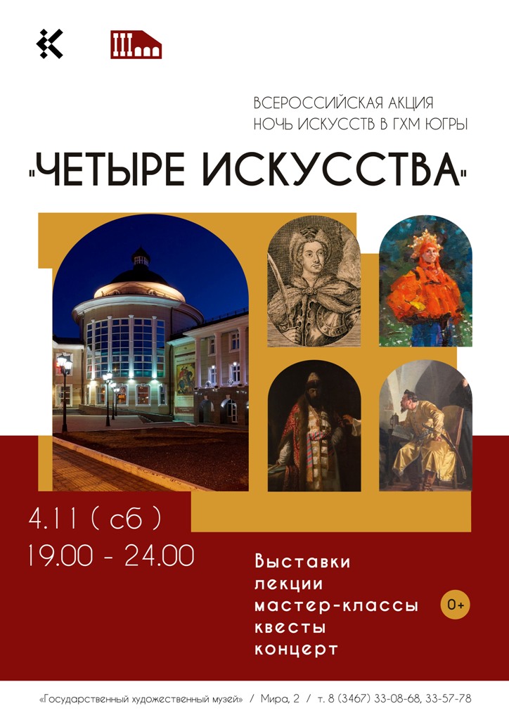 4 ноября в Югре проводят Всероссийскую культурно-образовательную акцию «Ночь искусств». Она приурочена к празднованию Дня народного единства. Государственный художественный музей традиционно присоединяется к акции с большой и увлекательно программой. В этом году она пройдёт под лозунгом «Четыре искусства».