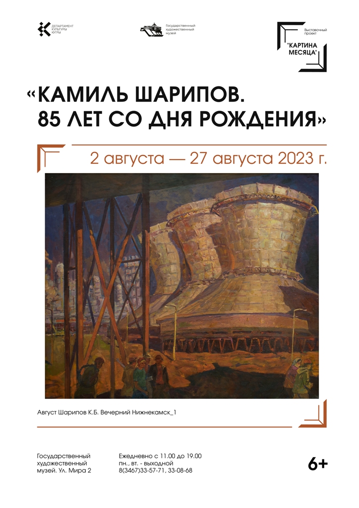 В 2023 году исполняется 85 лет со дня рождения советского художника-живописца Камиля Шарипова. К этой дате в рамках выставочного проекта «Картина месяца» в экспозиции будет представлен индустриальный пейзаж «Вечерний Нижнекамск» (1977).