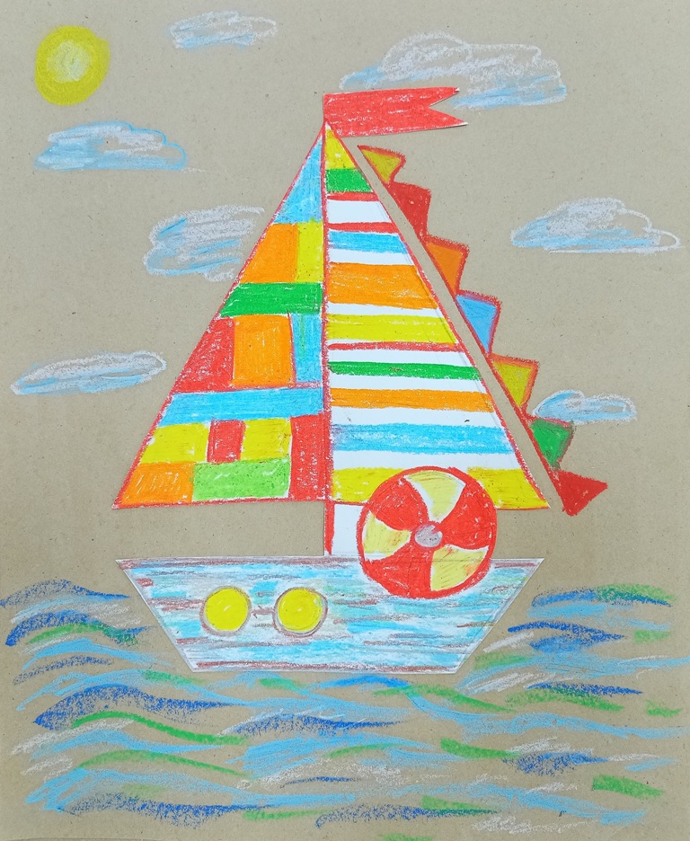 Вы увидите морские пейзажи с кораблями и выполните композицию с парусником в технике аппликации с дорисовыванием масляной пастелью.