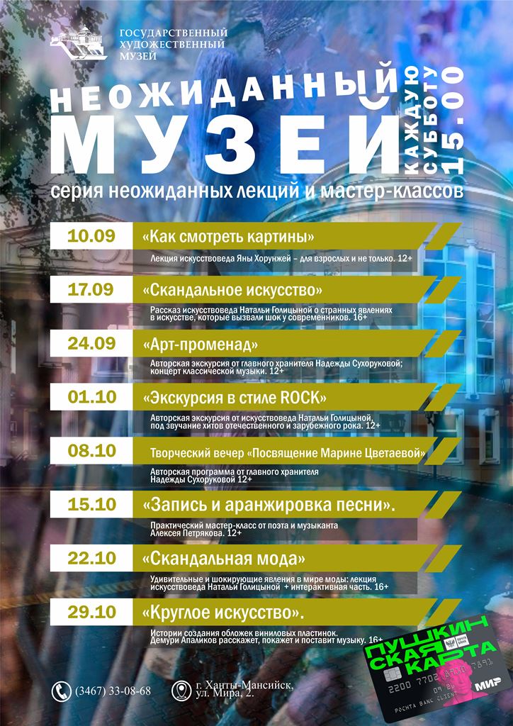 Вы знали, что музей может быть местом увлекательного времяпровождения? Встретиться с интересными людьми, узнать много нового и просто хорошо отдохнуть – все это вы сможете в Государственном художественном музее Югры.