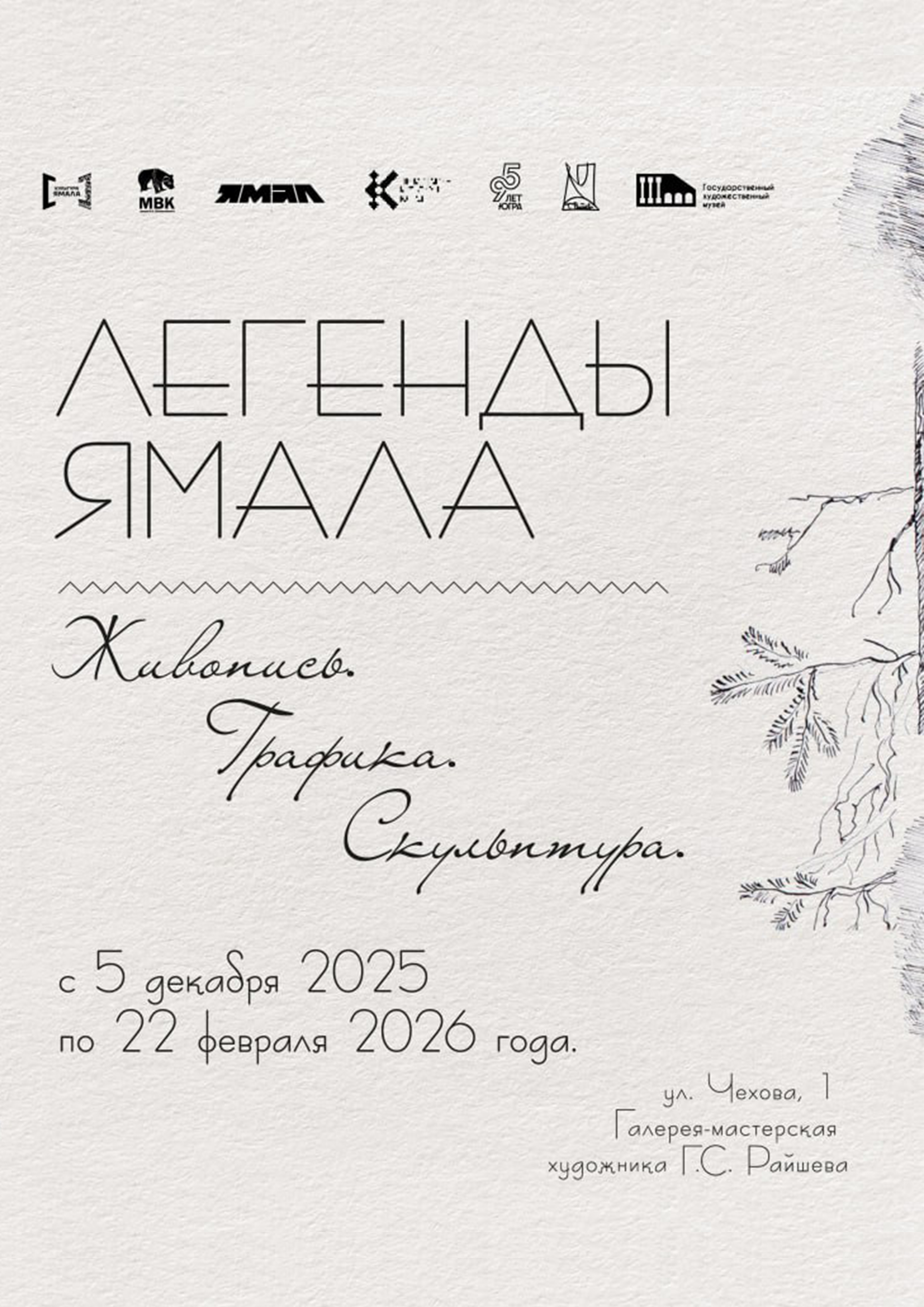 5 декабря в Галерее-мастерской художника Г.С. Райшева состоится открытие выставки «Легенды Ямала. Живопись. Графика. Скульптура» из фондов Ямало-Ненецкого окружного музейно-выставочного комплекса им. И.С. Шемановского». Событие приурочено к 95-летию Ханты-Мансийского автономного округа – Югры и Ямало-Ненецкого автономного округа. Реализация перекрестной выставочной программы – значимое событие в культурной жизни Югры и Ямала и осуществляется в рамках межрегионального проекта «Культурное сотрудничество».