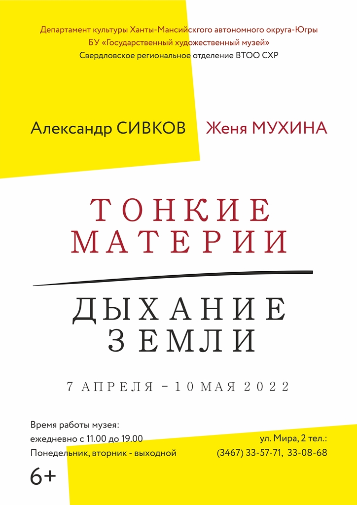 С 7 апреля в Государственном художественном музее в рамках цикла «Художники России» начнёт свою работу выставка «Тонкие материи. Дыхание Земли. Александр Сивков и Женя Мухина». Выставка представляет произведения члена Свердловского регионального отделения ВТОО «Союз художников России» Александра Сивкова (Екатеринбург) и художника, дизайнера, иллюстратора Жени Мухиной (Новоуральск).