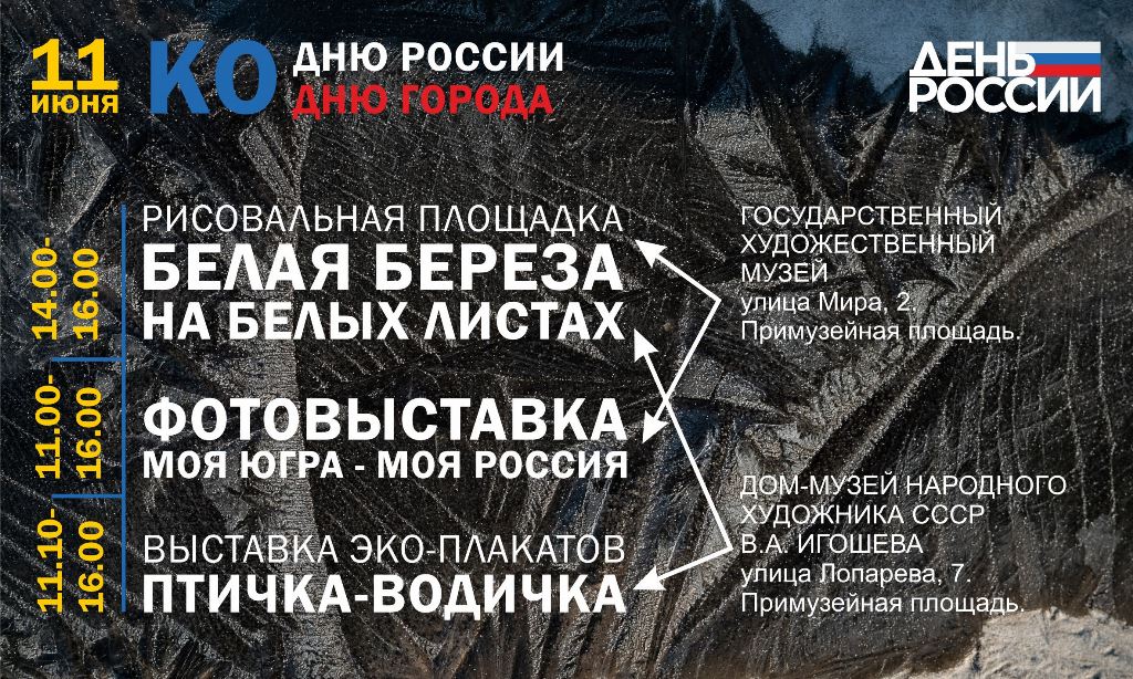 11 и 12 июня 2021 года состоится культурно-просветительское мероприятие «Моя Югра – моя Россия», приуроченное ко Дню России. Мероприятие пройдёт на примузейных территориях Государственного художественного музея Югры ул. Мира 2 и филиала «Дом-музей народного художника СССР В.А. Игошева» ул. Лопарева 7.